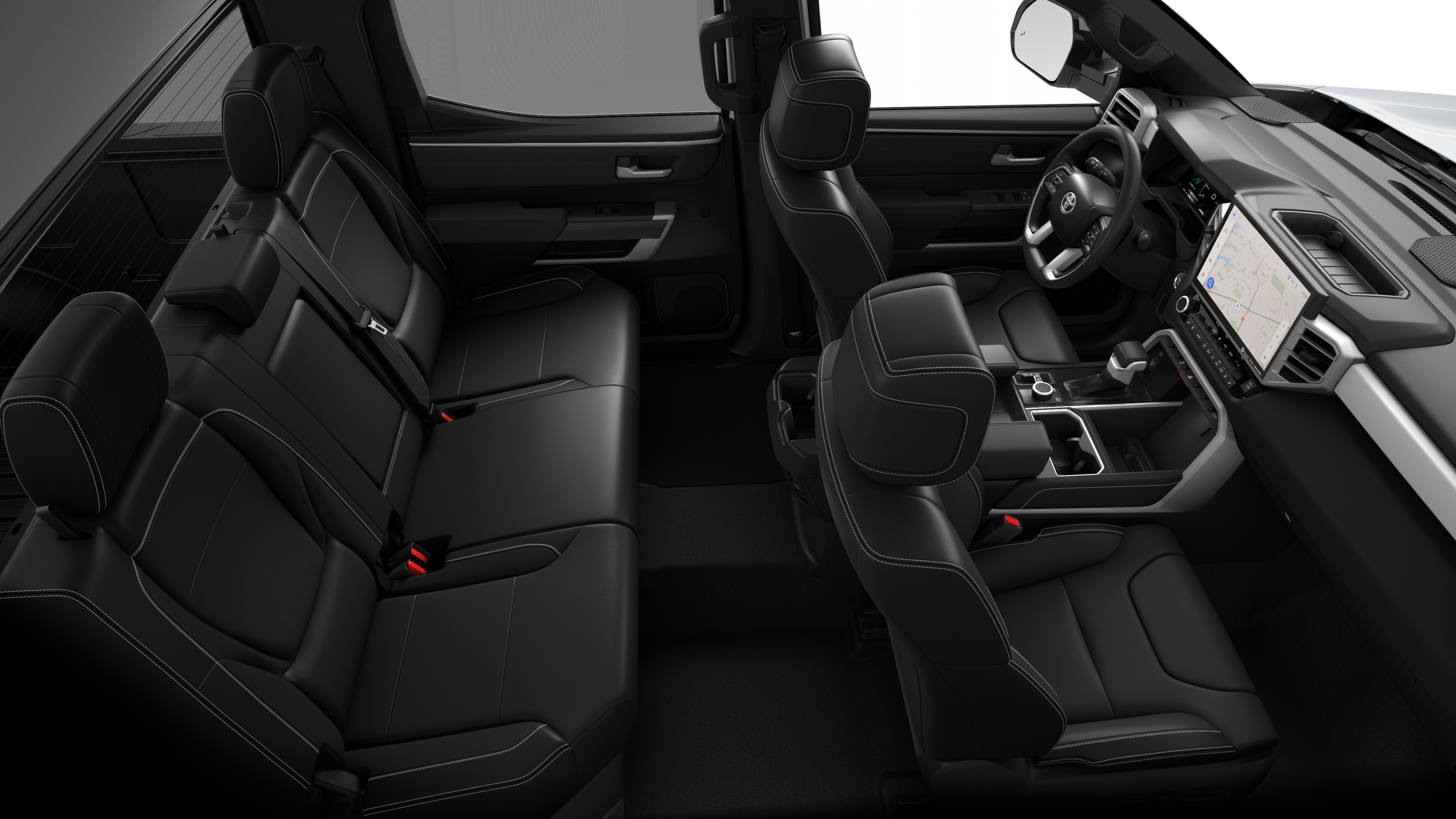 - Leather-trimmed seats with contrast stitching; 8-way power-adjustable driver and front passenger seats with power-adjustable lumbar support